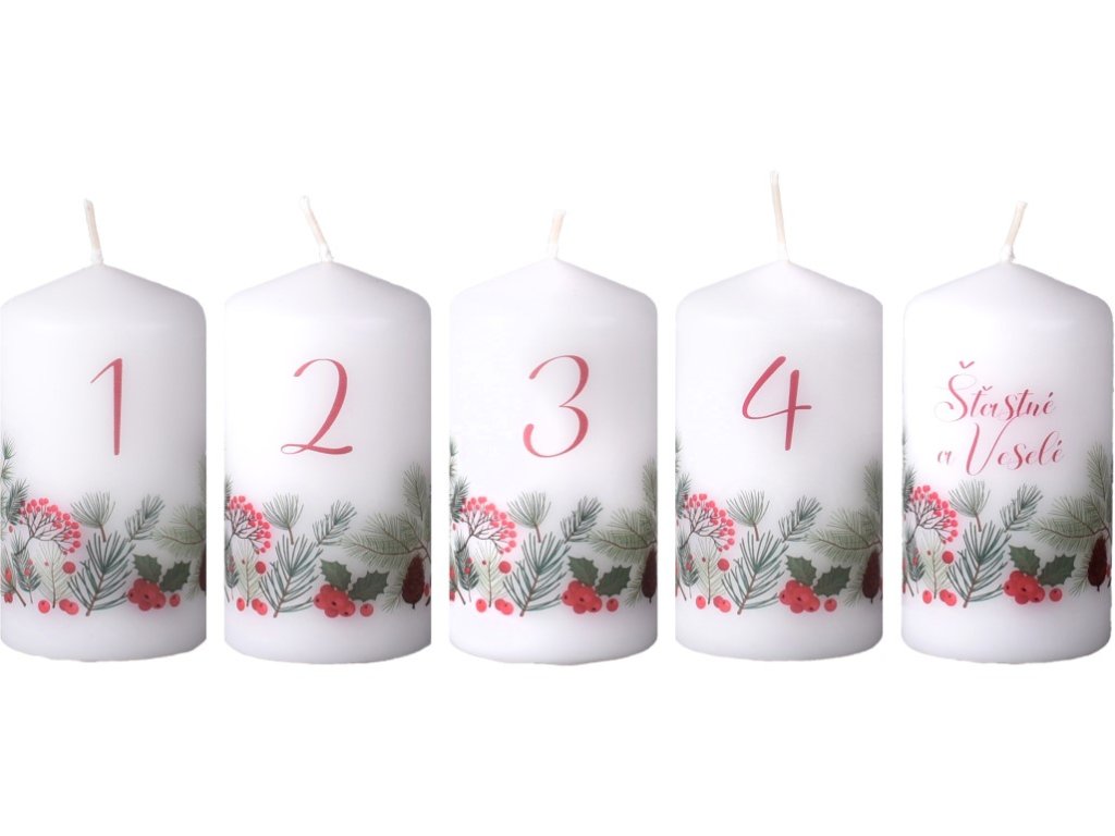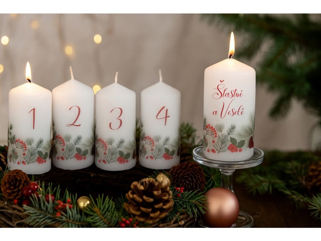 Svíčky jsou označeny čísly 1–4 pro každý adventní týden a doplněny o jednu extra svíčku s nápisem “Šťastné a veselé”, která krásně doladí vaši vánoční dekoraci.