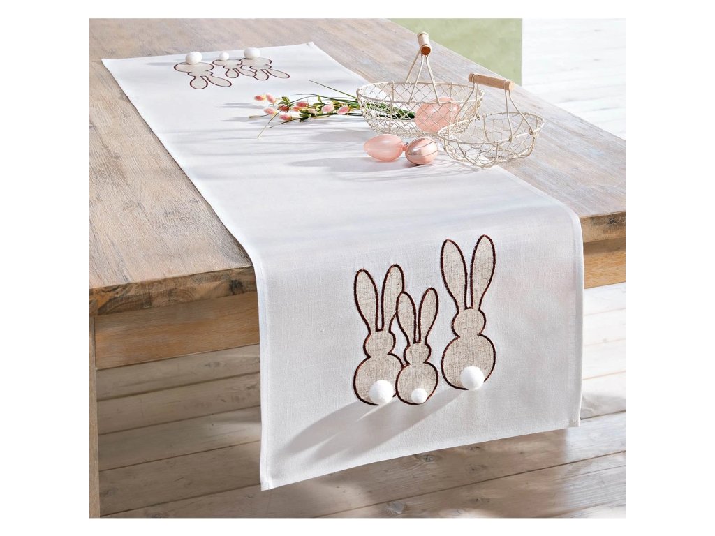 Roztomilí zajíčci dodají vašemu stolu veselou a sváteční atmosféru. Tento stylový běhoun na stůl zaujme originálním 3D efektem – ocásek každého králíčka je tvořen měkkou bílou bambulí, která působí hravě a zároveň elegantně.