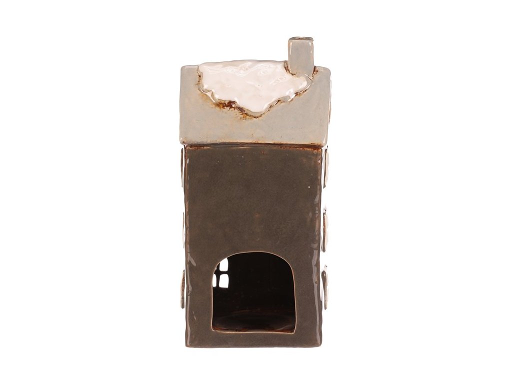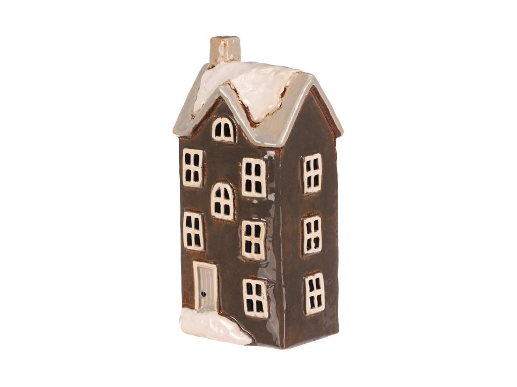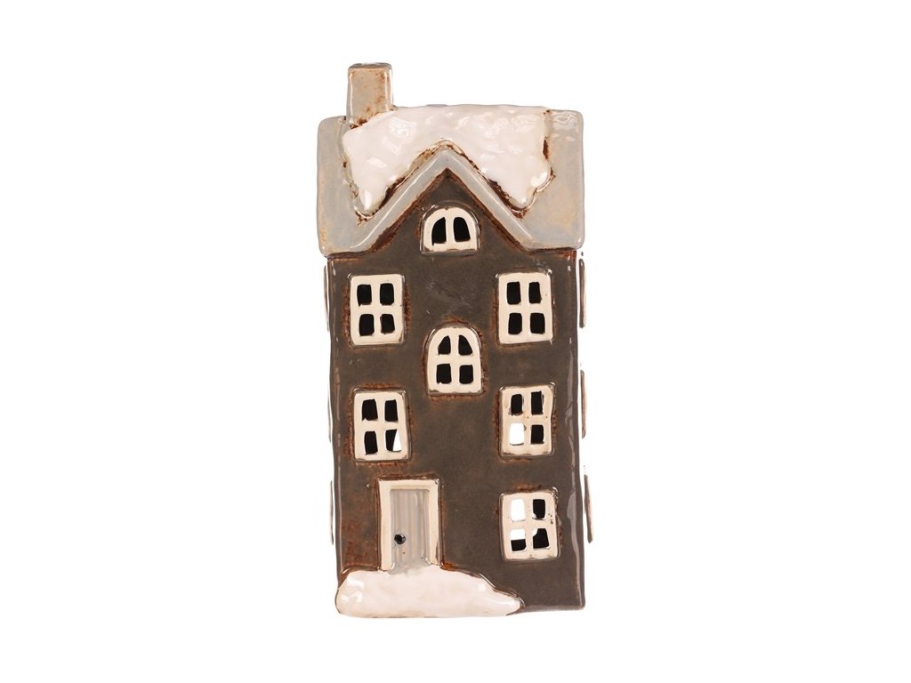 Keramický patrový domek s tmavě šedou fasádou a světle šedou stříškou, která je pokrytá trochou sněhu, je skvělou dekorací na dlouhé podzimní a zimní večery. Je v něm prostor pro čajovou svíčku, což umožňuje vytvářet kouzelnou atmosféru, díky paprskům pronikajícím ven skrze všechna okénka. Ideální dekorace pro příjemné zútulnění domova.