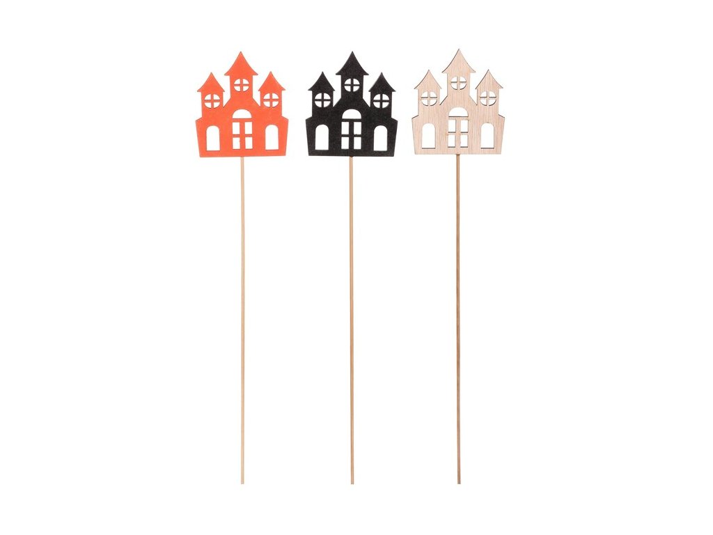 Dům s věžičkami na zápichu ve třech barevných variantách bude skvělým základem pro tvorbu té správné výzdoby na Halloween a dušičkové období. Dekorace je na špejli o délce 25 cm tyto dřevěné ozdoby jsou ve třech barevných variantách - oranžovou, černou a béžovou. Můžete si tak hravě vytvořit správně děsivé prostředí, které bude hrát barvami a nejrůznějšími strašidelnými prvky.
