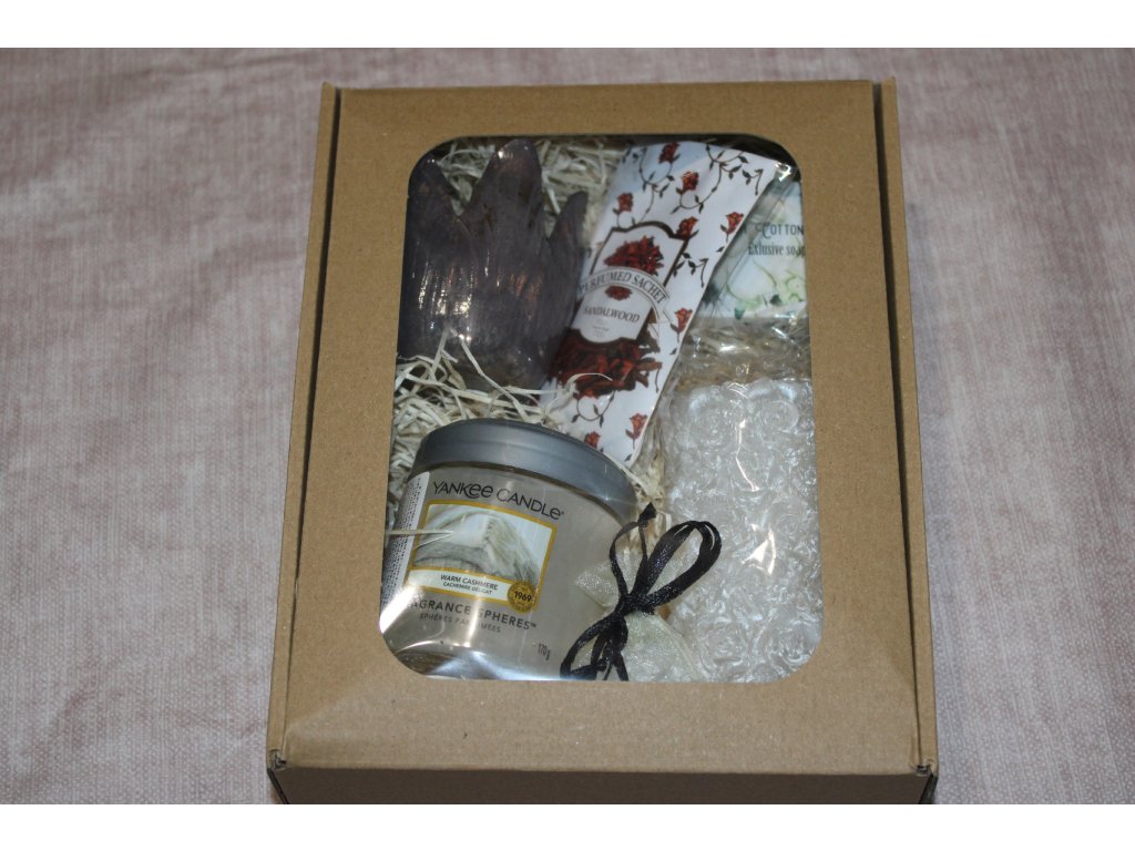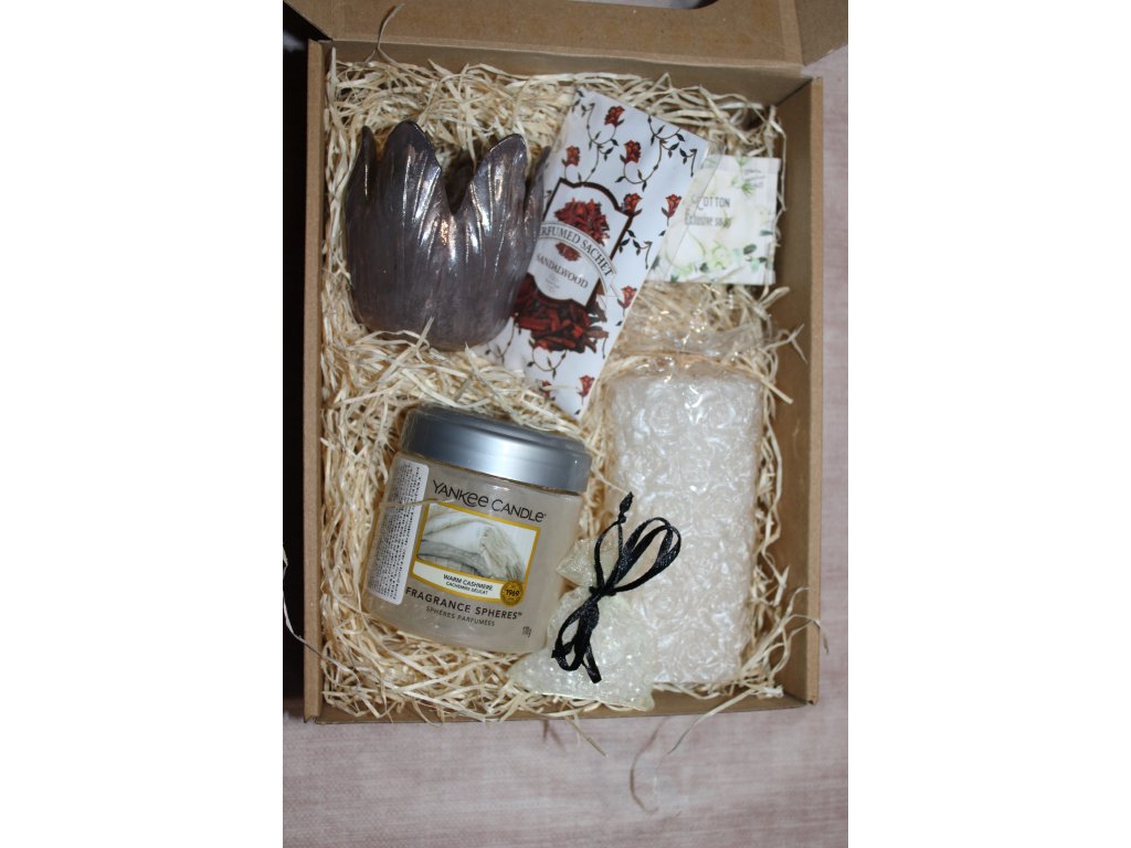 Součástí balení je mýdlo s jemnou vůní bavlny, které evokuje pocit čistoty a klidu, vonný sáček pro dlouhotrvající provonění interiéru a skleněný svícen ve tvaru květu, jenž dodává celému setu nádech luxusu. Dominantou krabičky je exkluzivní svíčka s perletovým efektem, zdobená po celé ploše jemnými květinovými motivy.