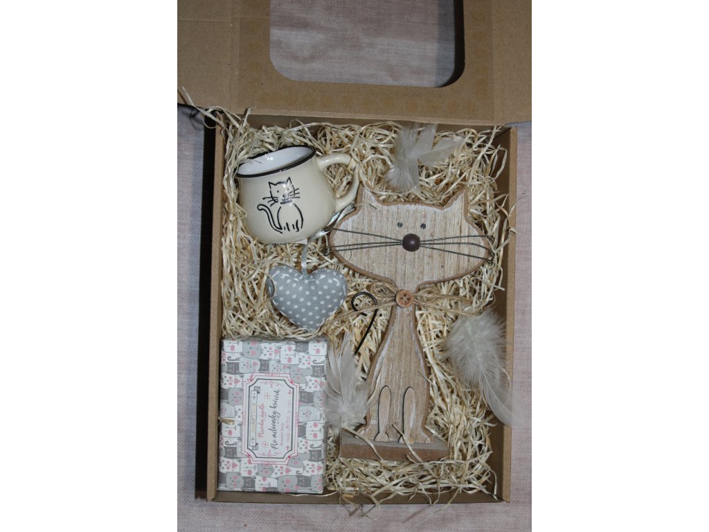 Uvnitř krabičky najdete dřevěnou dekorativní kočku, která se stane krásným doplňkem interiéru, látkové romantické srdíčko pro jemný a osobní nádech, stylový hrnek s motivem kočky pro každodenní chvíle pohody a mýdlo pro milovníky koček, které potěší nejen vůní, ale i tematickým provedením.