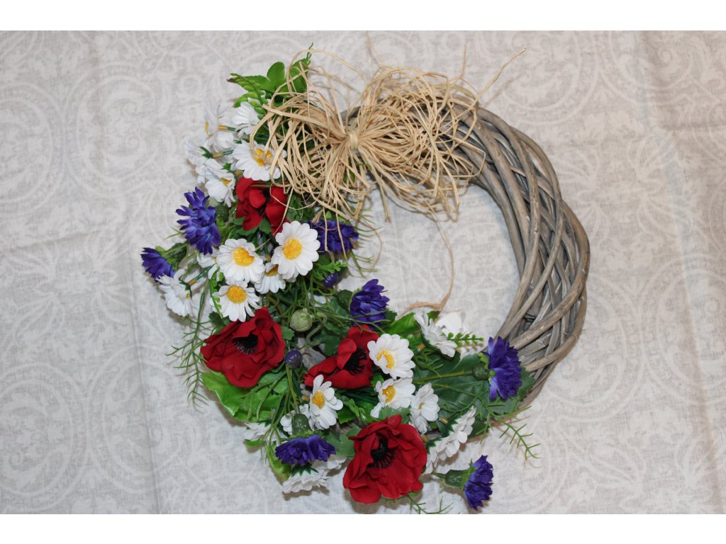 Proutěný věnec s kopretinami, vlčími máky a chrpami s lýkovou mašlí