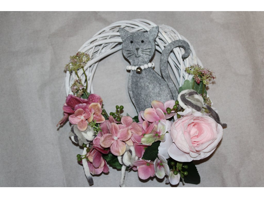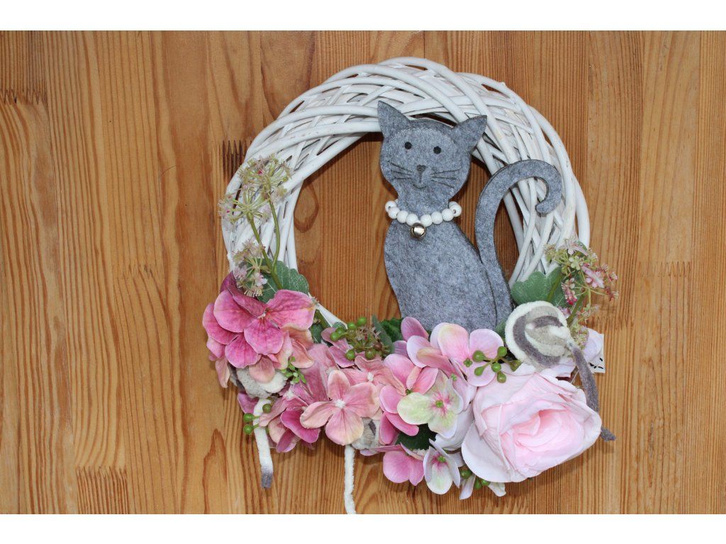 Vneste do svého domova nádech něžné venkovské pohody s tímto originálním proutěným věncem. Kombinace jemných květů, dřevěné kočičky a veselých klubíček vytváří hravý, ale zároveň elegantní celek, který potěší nejen milovníky koček.
