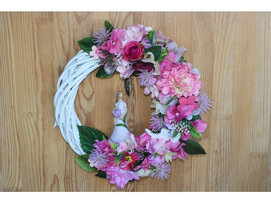 Umělý věnec v jemných růžových tónech s motivem dívky s květem je něžnou a romantickou dekorací, která zaujme na první pohled. Harmonická kombinace květin v pastelových odstínech růžové, doplněná o detailní zpracování listů, působí velmi přirozeně a vzdušně.