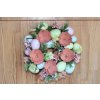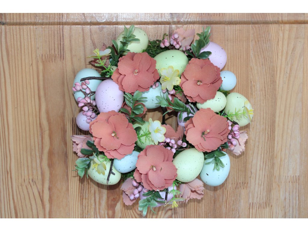 Krásný velikonoční věnec o průměru 32 cm je jemnou jarní dekorací, která vnese do vašeho domova svěží a sváteční atmosféru. Věnec je ozdoben umělými květinami, dekorativními vajíčky a dřevěnou dekorací ve tvaru květu, které společně vytvářejí harmonický a přirozený vzhled.