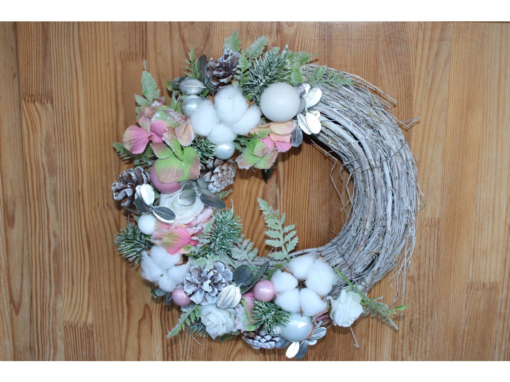 Vneste do svého domova jemnou, elegantní zimní atmosféru s tímto nádherným věncem z přírodního proutí, který je laděný do bílo–růžových tónů. Věnec je dozdobený bavlníkem, šiškami a dalšími drobnými dekoracemi, díky čemuž působí měkce, romanticky a zároveň velmi přirozeně.