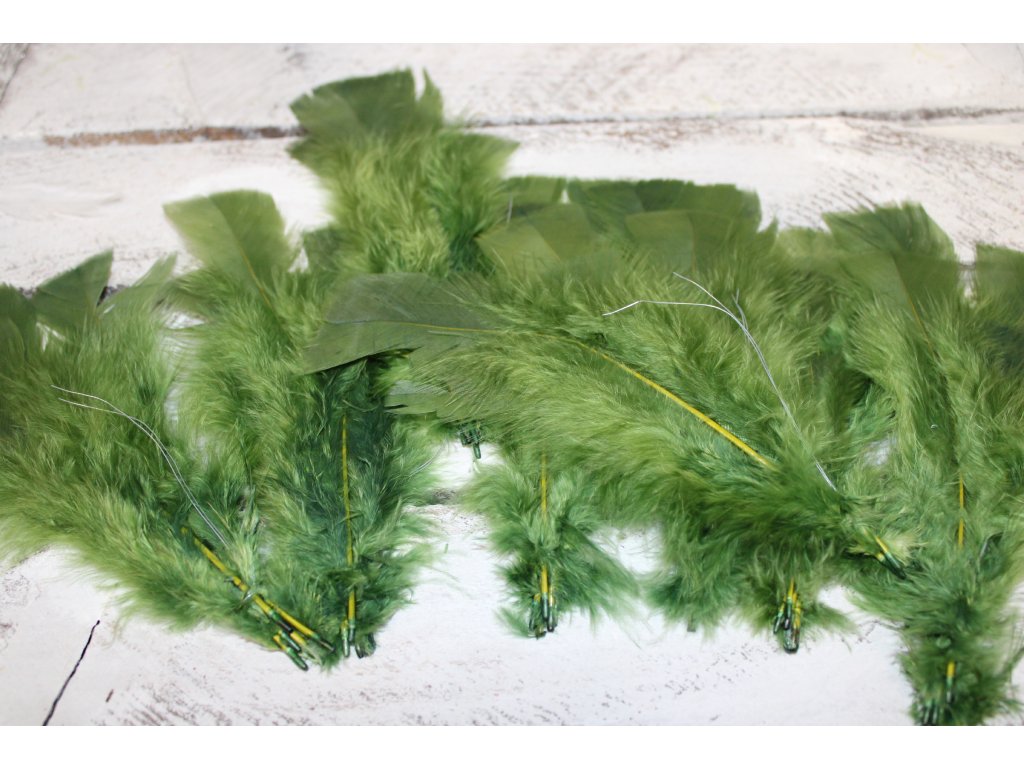tmavě zelená velikostně cca 17 x 4 cm devět svazečků po cca 4-5 peříčkách
