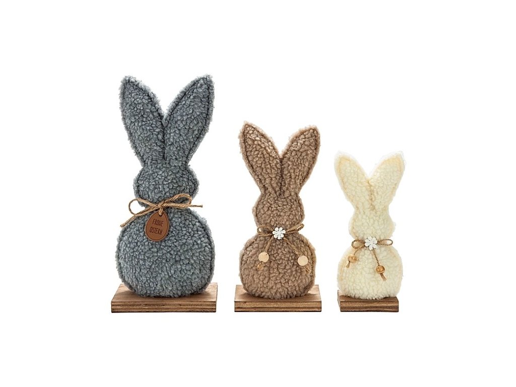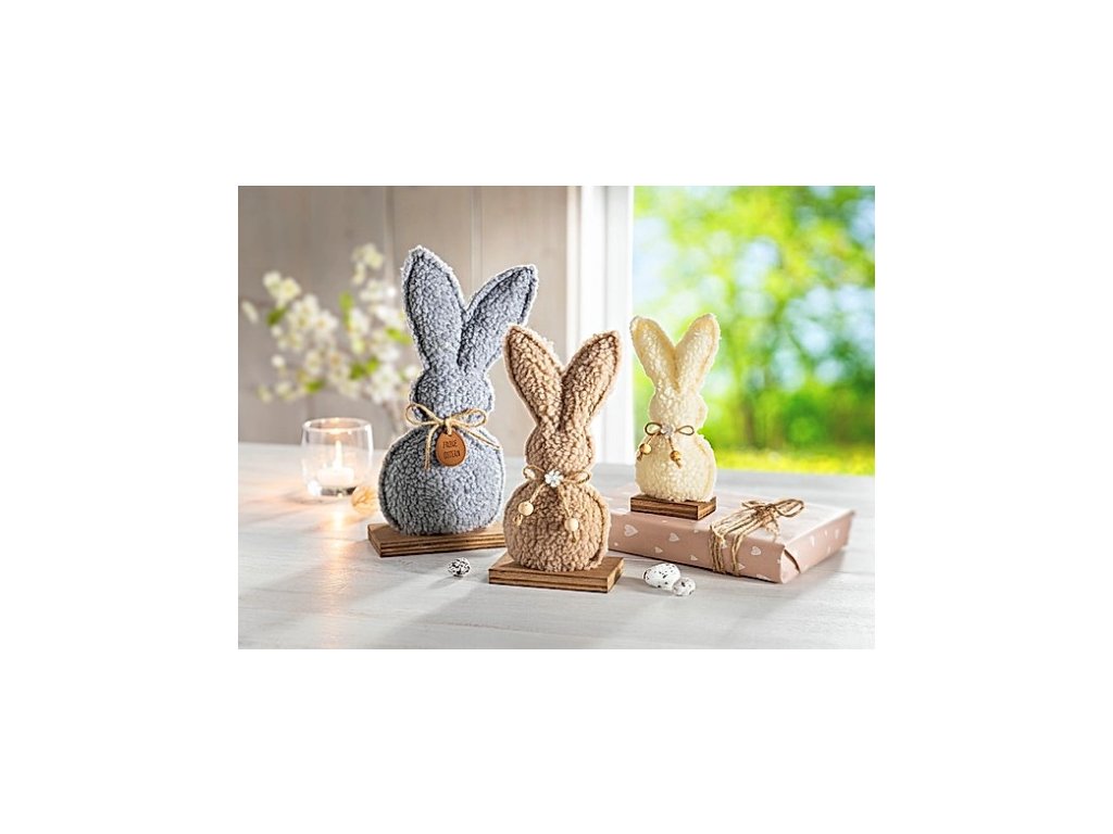 Stylová sada tří dekorativních zajíčků v jemných přírodních tónech je krásným doplňkem velikonoční i jarní výzdoby. Zajíčci jsou usazeni na dřevěných siluetách králíků a potaženi hebkým plyšem (polyester) v krémové, béžové a šedé barvě, který působí hřejivě a útulně.